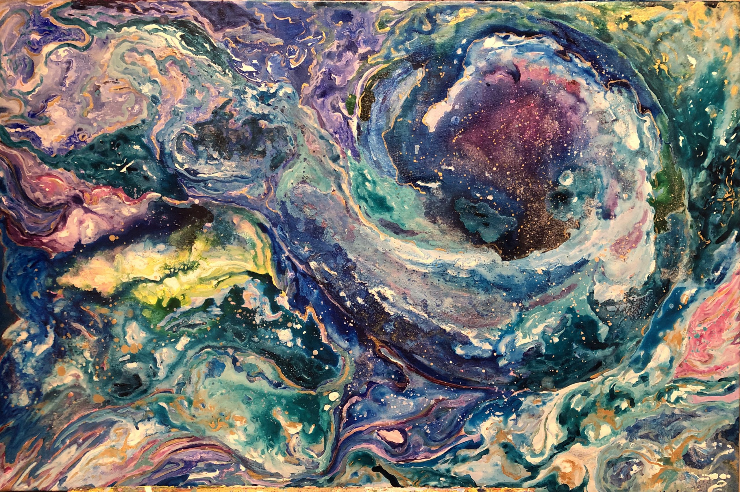 I have always been curious about why we are here and how everyone’s journey is so different. We are made from the same particles as stars and I feel that it represents that we come on this planet from the cosmos. The figure you see in this painting represents a fetus in the womb on its journey into the world. Your eye might see something different though. Or feel something different. This piece also has salt and sugar infused in it representing the yin and yang of life. The sweet moments and the salty tearful moments. This piece also toured Italy in 2018 for several exhibits there. I think it saw more of Italy than I did! What is your soul’s journey?
