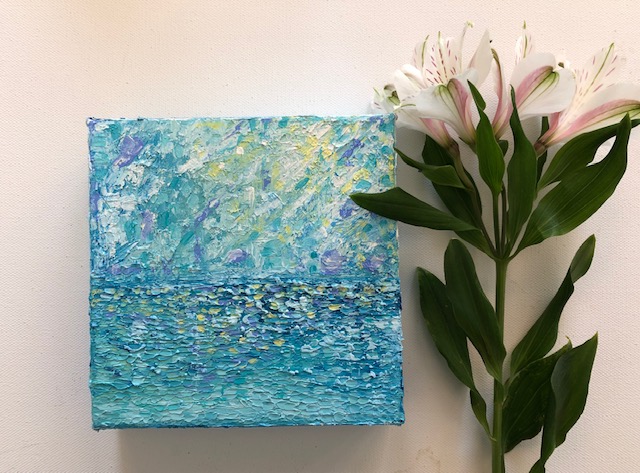 This is a 6×6″ oil on canvas painting depicting the energy I feel when I am by the beach. Can you smell the salty air and feel the cool water against your feet? I hope you feel that every time you see this painting.