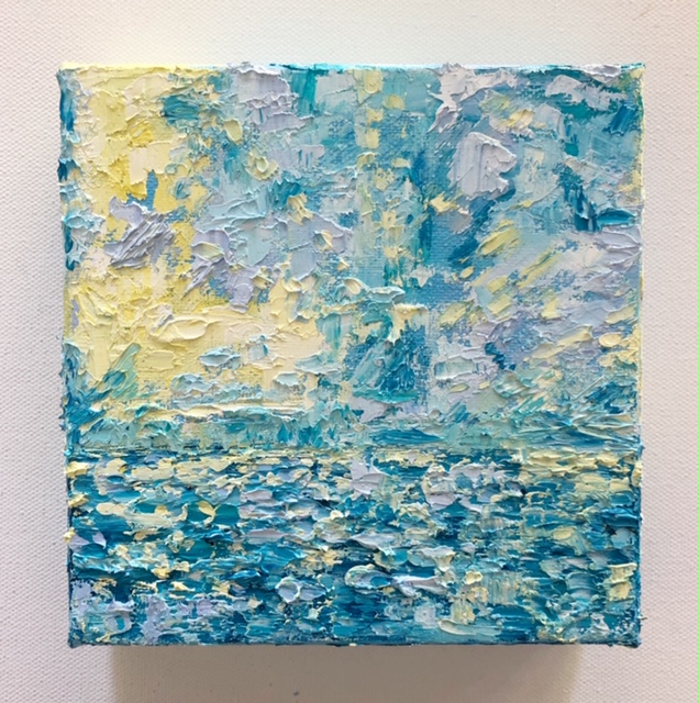 Feel the sun on your face while feeling the ocean breeze against your skin when looking at this painting.  Summer days are gone as fall is coming into our lives again.  But that doesn’t mean that you can’t have that feeling in your home.  This painting is inspired by my summer days at the beach and the energy I feel from the ocean.  This painting is 6×6″ and 1.5″ deep.